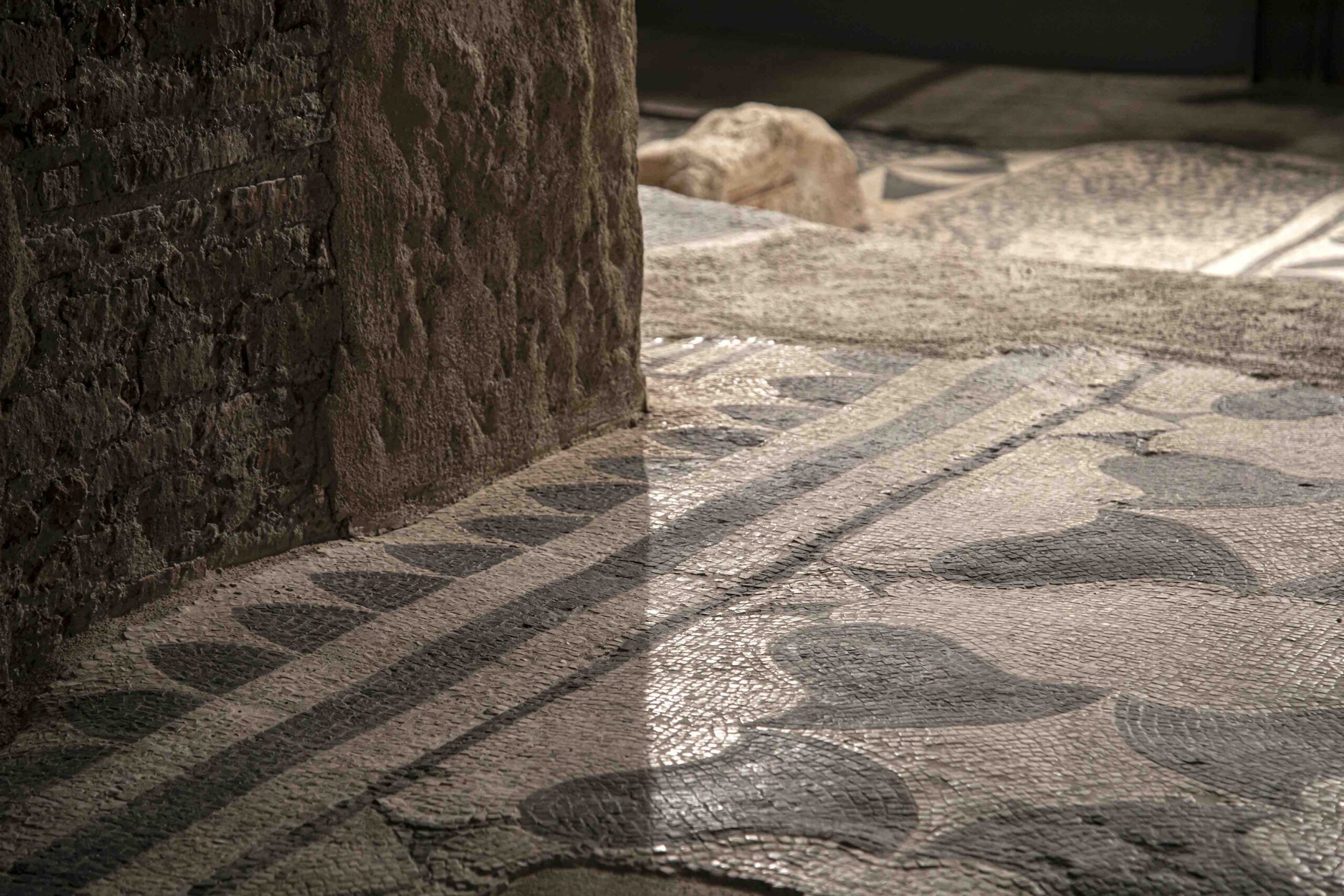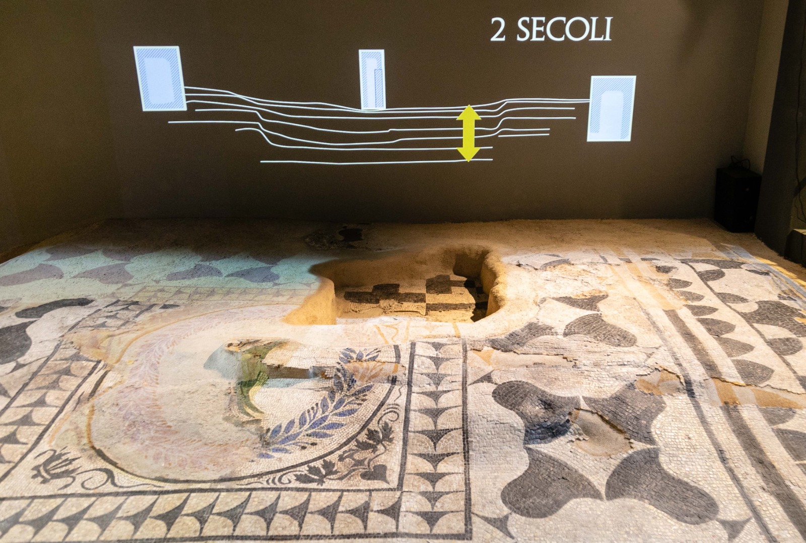 Gli scavi hanno individuato un muro in blocchi, interpretabile come un apprestamento militare, e un’imponente muratura di costruzione che segna un diverso utilizzo dell’area: da difensivo per la collettività a residenziale privato. Sono stati messi in luce in un settore sei livelli pavimentali sovrapposti, che per esigenze di tutela e di valorizzazione sono stati delocalizzati. I Tecnici della Soprintendenza, grazie al sostegno finanziario di BNP Paribas RE hanno progettato un’inedita scatola archeologica, un contenitore, una sorta di scrigno per racchiudere, proteggendolo, un tesoro del patrimonio culturale. Attraverso un rigoroso lavoro di distacco, coordinato dalla Soprintendenza, sono stati ricollocati nella scatola archeologica – alla stregua di uno straordinario puzzle – le opere murarie e i mosaici, esattamente come riemersi al momento della scoperta.